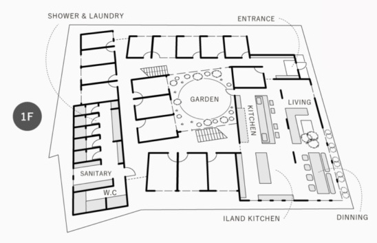 ワンフロア事に見ていくと少しわかりやすくなりますね。そうです右上に玄関/ENTRANCEがあります。そして玄関のすぐ左にははリビングルームとキッチンが広がっていますね。いろんな形の四角や丸が集まっていますが、とっても大きな空間がありそうです。40人分のリビングスペース、キッチンエリアになっているのでしょう。そのままリビングを抜けると、右手にお庭/GARDENがあり、左手には部屋が3つ並んでいます。そうです。このシェアハウスENN HYOGOには中庭があります!しかも結構大きいそうですね!このシェアハウスの大きな目玉スポットでしょう。そしてそのまま突き進むと、洗面所/SANITARYとお手洗いがあります。シャワーブースが5つありそうです。そのまま廊下に戻り、進むと右手に部屋3つ、左に4つあります。そして右折をすると左手に5つ部屋があります。そしてそのまま玄関へ。あれ!?1周してる?なんと!このシェアハウス円になっています。ずっとぐるぐる回れそうです。